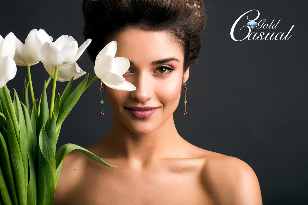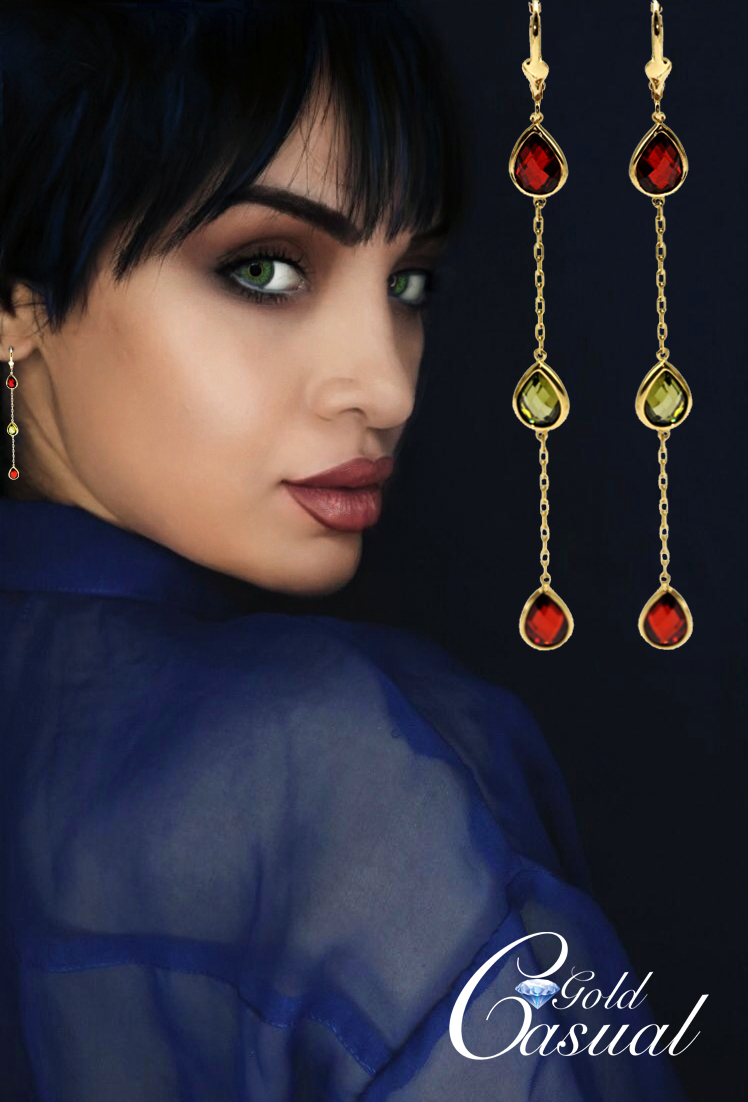 Fine ørering i 14 karat med rød granat og grøn moldavit sten.